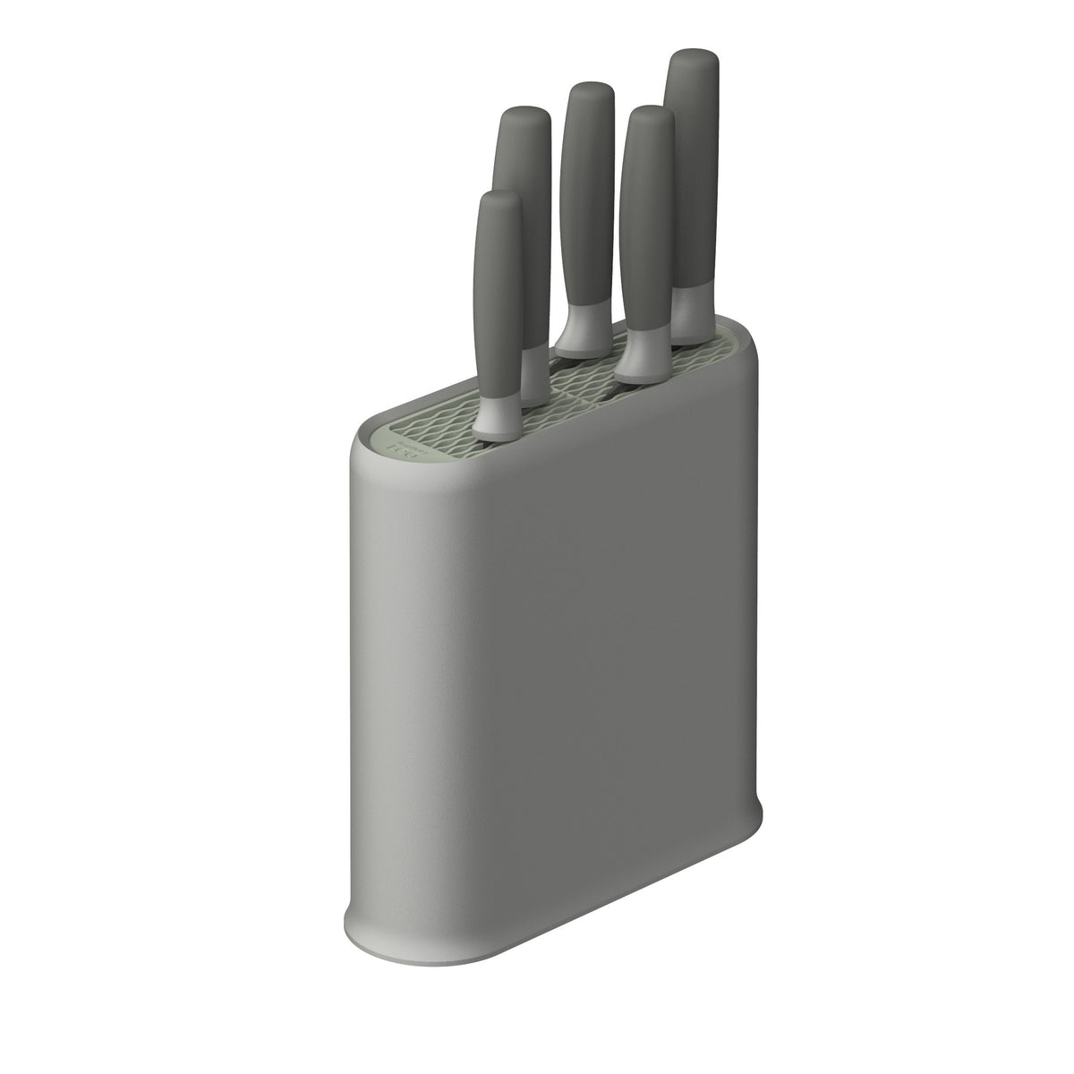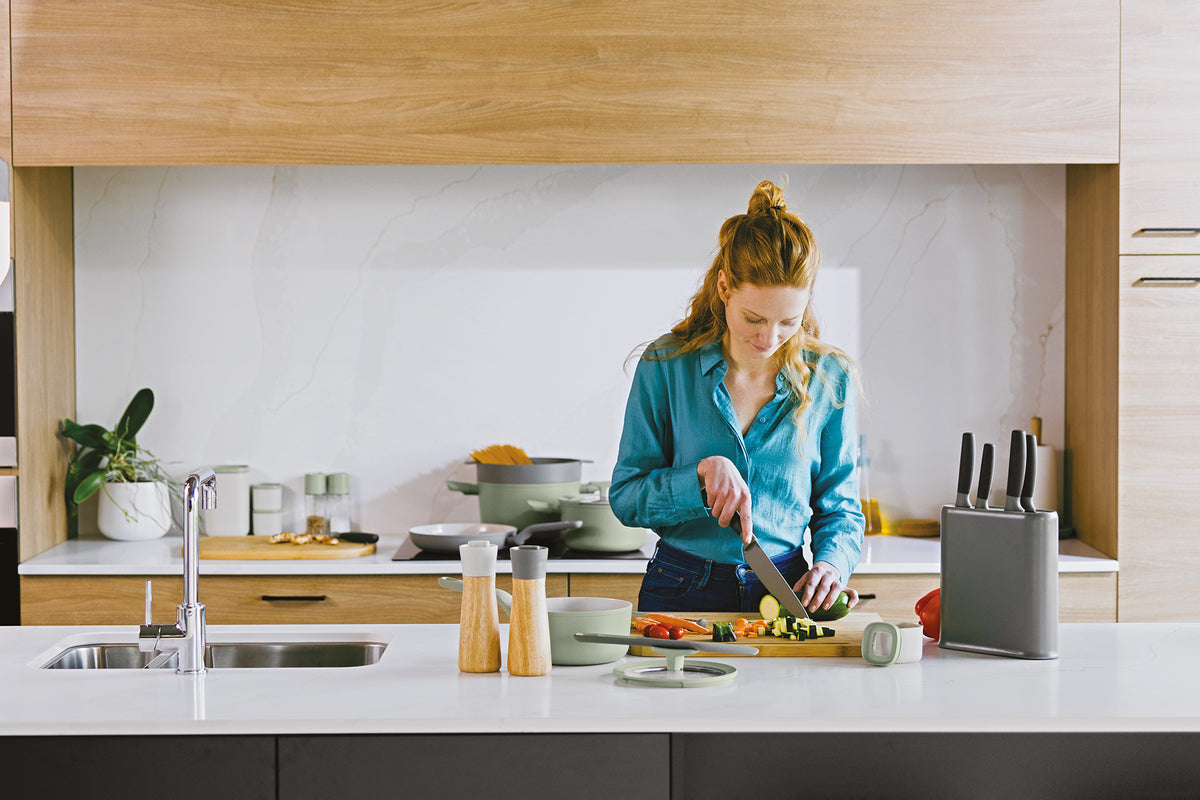 Добавьте немного «зеленого» в вашу кухню с помощью переработанного пластика, использованного при изготовлении подставки и ручек ножей. Благодаря сочетанию современного дизайна и практичных функций этот 6-предметный набор станет настоящим украшением любой кухни. Подставка имеет противоскользящее основание для надежной фиксации и двустороннюю сменную вставку, позволяющую выбрать между серым и шалфейным цветом. В набор входят нож для очистки, овощной нож, малый шеф-нож, шеф-нож и нож для хлеба из нержавеющей стали с мягкой ручкой и лезвием с антипригарным покрытием. Готовьте с комфортом, легко нарезая и шинкуя продукты!